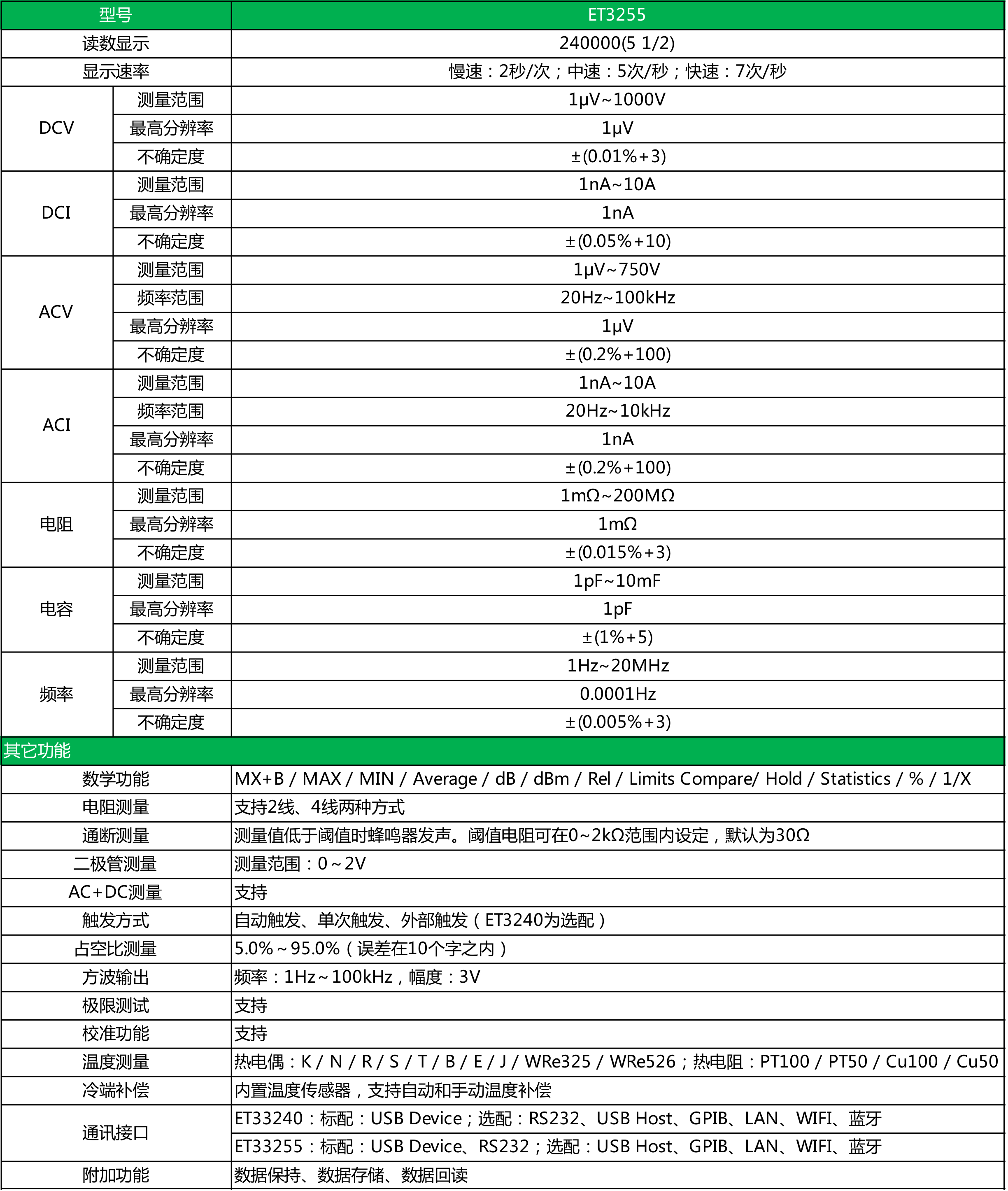 ET3255为功能全面、性能稳定的真有效值数字万用表,本系列台式万用表提供强大功能,出色的性能,良好的用户体验;3.5寸TFT液晶屏显示、读数清晰、内容丰富,具有良好的显示效果。本表采用市供电驱动使之成为高可靠性数字台表。全功能、全量程过载保护和独特的外观设计使之成为电工以及高校实验室的首要之选。
